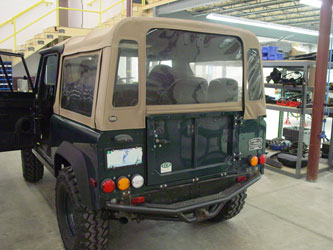 This images shows the rear of the 90 back together. The tire carrier parts are now all back on and working correctly and everything opens and closes as it should, unlike when the tire carrier was damaged. Badger Coachworks also fixed the ripped rear window for us and we replaced the damage lower rear window bar that holds the bottom of the rear window in place.