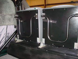 Here you can see the repaired jump seats with our powder coated alloy bases. These are stronger and much longer lasting than the cardboard that the original seats came with. We hope the damage doesn't happen again, but if it does the seats will have a much better shot at taking the abuse instead of breaking, and we think they look better too.