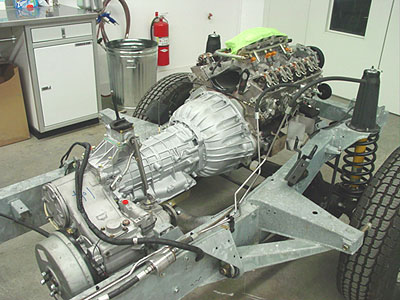 This image shows the new drive-train installed into the rolling chassis. You can also see the new stainless steel fuel lines are in place and will now bee hooked up to the fuel rail on the engine. Next up the stainless steel brake pipes will go into place and then the newly painted body panels will start to go into place.