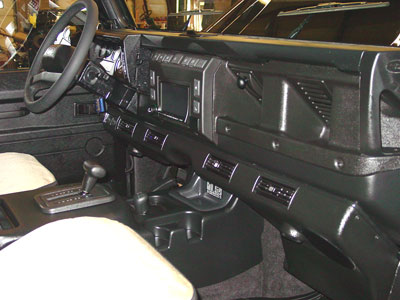 Here you can see the finished dash section with the touch screen navigation system and leather wrapped steering wheel. Our goal is to make our custom trucks look like the factory could have built them, and this 110 is another example of a Defender 110 that the factory never built, but we have made it all look correct with even better than factory fit and finish.