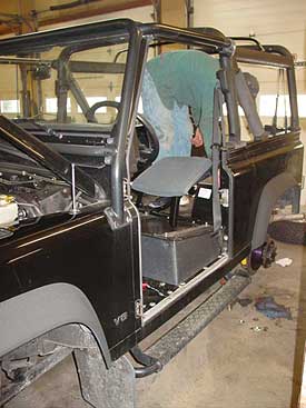 This 90 is in great shape, but as with any car that has been around since 1997 we have a number of small things to address. We have removed the doors so that we can install the new upgraded hinges that have already been primed and painted in the correct base/clear black. We'll also need to modify the door panels slightly for the new sound systems speakers, so we'll keep those parts off the Rover for now. The front seats have been removed so that we can weld the seat bases to stop that annoying "click" you sometimes hear in the seats on a Defender. You will also note we have removed the factory top. We will be installing a new upgraded top shortly that will cure all the ills of the factory top.