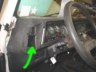 Inside the 90 we have started to get things in order as well. The dash plastic parts have been badly beat up and most are cracked and broken so that things are not working like they should. The heater control cables are seized, some are broken, and the steering column surround grinds on the steering wheel. All of these items are easily fixed to make the dash secure, make the heater controls work with just one finger and make the truck squeak free. It just takes some new parts and a little care during installation. The green arrow points to the new dash surround we have installed and with that installed all the other systems can be made to work correctly. You will also notice we have removed the AC system fro this 90 and put it back to stock with the correct footwell vents and the correct fuse box cover.