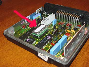 Next step to complete the engine install is to upgrade the chip the EFI computer to let the EFI system know it has a 4.6 under the hood instead of just a stock 3.9. Here you can see the chip installed in the original ECU. This set up will now be installed into the 90 and we'll fire the engine up for the first time..