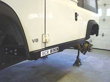 Up front the sliders are mounted to the frame via 5 bolts. This prevents any "twisting" like the units that bolt to the bulkhead bolts. We do we do this? Because we have seen a lot of other mail order sliders bend and/or damage the body of peoples Defenders, and we think the purpose of a slider is to protect the body, not damage it. If we loose a few bucks because we can't offer these units mail order, so be it. We will only put our name on products that work.