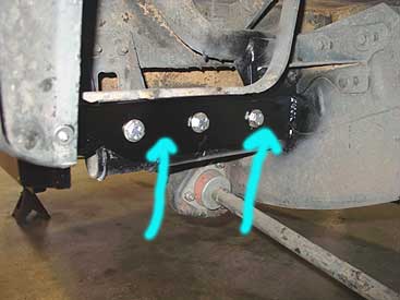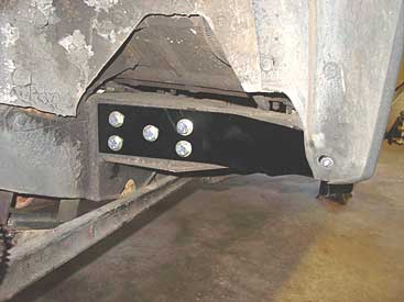 At the rear the ROX sliders mount to the frame via some added beef that we install on the frame. The stock frame is not strong enough to take real off road abuse in this area, so we make the frame able to handle our sliders (see arrows). Once the steel strengthening piece is welded in place the sliders can be bolted to it. We also use 3 bolts and reach all the way to the frame rail so that the slider can not "lift" or "twist" when you hit an obstacle. This assures that our sliders will never hurt the body of your truck like some cheaper units do.