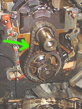 Here is a shot of one of the reasons why this engine would have not been on top of its game. The stretch in the timing chain (green arrow) will make this engine hard to start and make it perform poorly in all conditions.