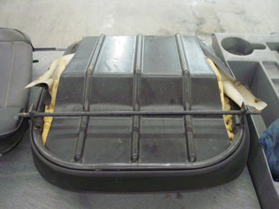 Underneath the repaired seat you can see that the foam bits are no longer falling out and the seat looks good again.