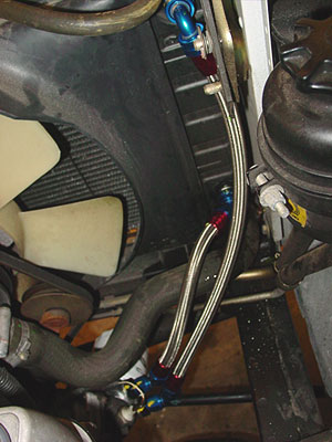 The last thing under the hood is to replace the oil cooler lines with our upgraded units. These will help keep the 90 from having an engine fire and will help keep the oil temps. down as well, as we route our lines far away from the hot exhaust manifold, unlike the factory originals that run right next to the RH manifold. For more data on why you need this upgrade go here.