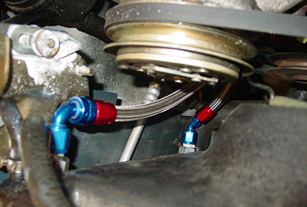 To help keep this beautiful low miles Defender from ending up destroyed in an engine fire we have installed a set of ROX stainless steel oil cooler lines. These replace the factory lines completely and route the oil "cooler" far away from the extremely hot exhaust manifold. This will not only help keep the oil cooler, but will help keep the oil line fire from happening. For more information on oil lines go here.