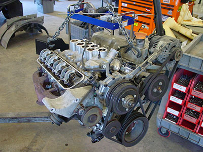 Here you can see the old 3.9 out and ready to go to an engine stand to surrender its parts that we will re-install onto the new, not rebuilt, Rover 4.6 liter engine.
