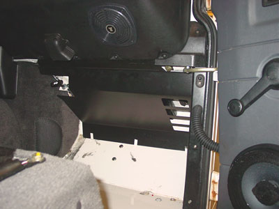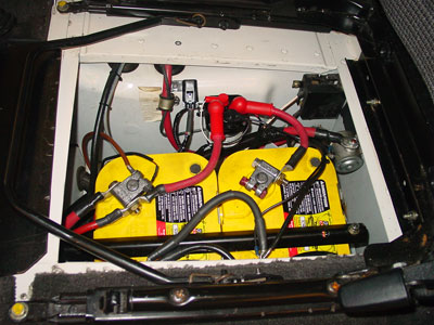 The control for the battery manager is mounted in the cubby box and keeps the second battery as a back up. So if you end up playing the music on the beach a little too long, you won't have to go looking for jumper cables. The system automatically kicks in the second battery when you start the vehicle, so you won't get left without power. This image also shows the new Alpine head unit, with satellite radio and iPod capability. Simply plug your iPod into the cable in the cubby box and tuck it safely away. All your iPod functions are now controlled by the radio itself for hours and hours of music.