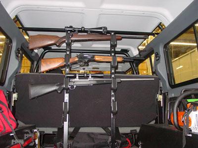 Inside the 110 we have made custom mounts for all the customer's requested gear. That includes a heavy duty gun rack for up to 4 guns. The gun rack has soft rubber pockets that protect expensive guns and it also has velcro straps that hold the guns from jumping out of the rack when off roading. There are also mounts in the cargo area for a chain saw, Warn recovery bag, kinetic recovery rope and more. All this gear is made to stay where you put it, so in case the truck rolls or is on an extreme angle off road, nothing will shift, move or hit any passengers.