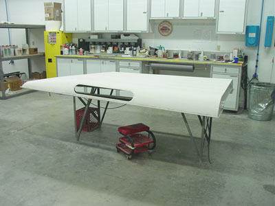 Here you can see the roof in the paint shop. The white paint will be removed and then the roof will be sealed and then numerous coats of Willow Green base and clear will be applied in our state of the art paint/bake booth.