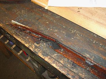 The first step is to remove all the rust and get the body support back to white metal. Here you can see that we are about half way through the grinding process to save these supports.