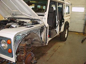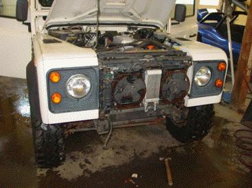 The left front fender of the 110 was damaged, so it has been removed and will be replaced with a new fender skin. Here you can see we have removed the skin and the new panel is in the spray booth getting primed and top coated in Alpine White.