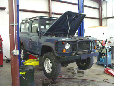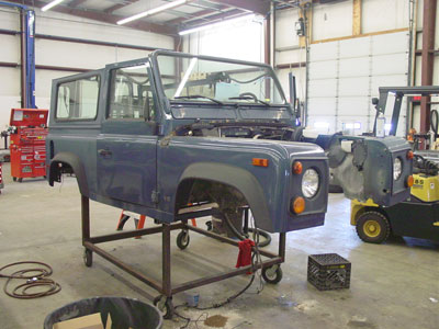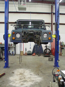 Now that the systems have been disconnected it is time to drop the original chassis out from under the Defender so that we can install the new galvanized frame. Here you can see the 90 on the lift being made ready for the chassis swap.