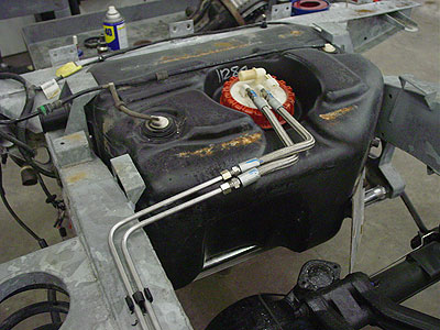 Here you can see the stainless fuel lines set up with the modified fuel pump. Holding the fuel tank in place is a new alloy ROX fuel tank skid plate so that corrosion possibilities in this section of the truck are now very limited. The tank is plastic, the skid plate is alloy, the frame is galvanized and the lines are stainless steel.