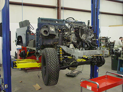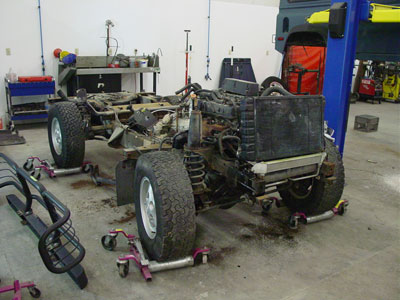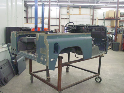 A little further along and you can see the body has been removed from the rolling chassis as a complete unit. This saves time and saves the customer money vs. taking everything apart. In this project we have to take a good bit of the body apart, but once off the truck we can do that much more efficiently.