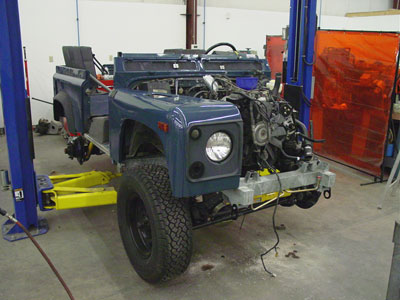 With the paint work done on the rear tub and the bulkhead it is time to put the body and chassis back together again. This image shows the truck going back together. At this stage all the new stainless brake pipes and such are run and hooked up. The new custom engine wiring harness is made and installed.
