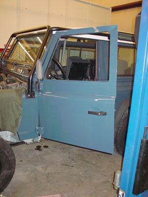 Here you can see the brand new doors that have been primed, painted and installed, no more corrosion here. The new door shell, along with its new style upgraded door hinges and stainless steel hardware will mean the end of corrosion in these areas for a long time to come. One nice side benefit of these newer style doors is that the door handles take a slightly different lock and that means we can key the doors and the ignition the same, meaning that the customer needs only 1 key to open the doors and start the Rover, unlike the stock 1997 Defender that needs 2 keys, 1 for the door and another for the ignition