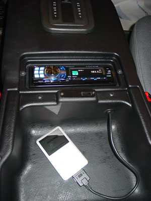 Those JL speakers are driven by a new Alpine head unit that has a direct iPod connection. Plug your iPod into the cable and tuck it away in the cubby box and then control all the functions of the iPod right through the Alpine head unit. The head unit charges the iPod as well and this system keeps your iPod out of sight.