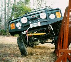 Overall suspension flex is increased but the road handling is still retained at excellent levels. Here you can see the rear axle still level on the ground and the suspension working nicely. The modified ECR front shock mounts give this Range Rover as much travel as possible without altering the front suspension geometry. (You can also see ECR's stabilizer relocation kit, tie rod guard and more.)