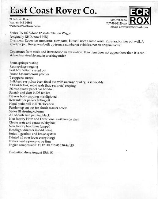 Recently one of our customers who was looking for a Series IIA 109 Station Wagon sent us this letter. His words speak volumes about both ECR and some of the other shops in the USA. Read the story below and keep in mind that not everyone has the same ideas about what makes a good Land-Rover, and "Buyer Beware"!