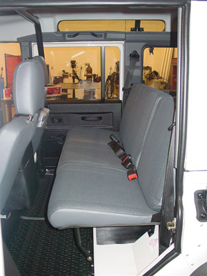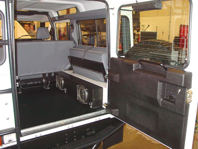 Cargo and rear passenger area, with updated rear door, sturdy bench jump seats and 2x 8" subwoofers for great sound reproduction.