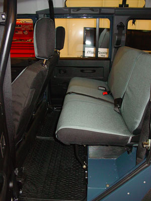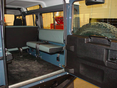 Here you can see the updated rear door and rear door interior panel. This set up is much stronger and longer lasting than the original 1993 parts, and looks better as well. You can also see the new jump seats and the cargo area tie downs that we have installed in the rear as well.