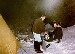Winter camping isn't as bad as you think. You quickly get used to it and with the right equipment it can be a great experience. Geoff and Jason set up the tent while Ian and I gathered firewood. The peacefulness of being in the heart of the Maine woods in the middle of winter is a wonderful experience. One of the best things about winter camping is that you don't have to worry about the bugs. Coyotes are another story... in the morning we found parts of a Moose that the coyotes had eaten a little too close to our camp site for comfort.