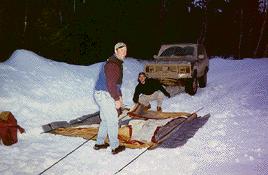 We left ECR early in the morning to get a good deal of miles done during the day so as to be able to set up camp that evening in the daylight. Our trip took us through the middle of the state on mostly back roads from Warren to the Greenville area. Once you leave the Greenville area and head north you are on roads that are rarely used except for logging operations. The other thing to remember is that once you leave Greenville, you are on dirt roads of varying condition and you won't find any more gas stations or stores until you hit the Canadian border. This meant extra fuel for the Rovers had to be carried on board just to make it in and out. Greenville in the winter is a snowmobilers paradise, and our plans to take trucks north of Eagle Lake in February were given more than few doubting laughs by the snowmobile riders we met at the Greenville gas station.