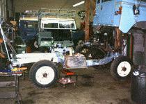 The answer... He hired ECR to do the frame change, rebuild the bulkhead(and paint it the Rover's original color), install a new wiring harness,and put the 88 back together so he can complete a quick, rust free, rebuildof the other systems on his own. Here we have removed the body and willremove the parts from the old frame.