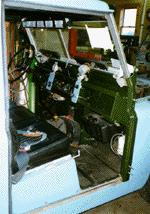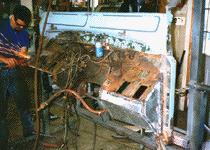 Here the SII's bulkhead is being remanufactured, by Allen from our staff,in our unique "bulkhead jig". This tool assures a factory perfectfit of every bulkhead we build. Why let someone weld on your bulkhead whodoesn't know what they are doing? The bulkhead is the back bone of the Roverbody, if it is wrong, the rest of the Rover can suffer with doors that won'tclose, premature rust, bad body lines, etc.