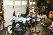 Here the old rusty frame has been removed. The new glav. coil frame willbe set up and the drivetrain parts cleaned and inspected and switch to thenew chassis.